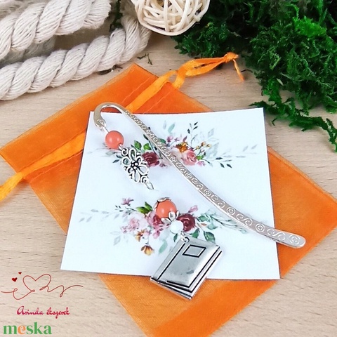 Könyv könyvjelző narancssárga és fehér gyöngyökkel, valamint tibeti ezüst kiegészítőkkel díszítve.