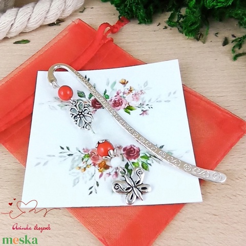 Pillangó könyvjelző piros és fehér gyöngyökkel, valamint tibeti ezüst kiegészítőkkel díszítve.