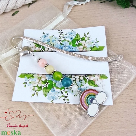 Szivárvány könyvjelző rózsaszín, sárga, zöld, kék és fehér gyöngyökkel, valamint tibeti ezüst kiegészítőkkel díszítve.