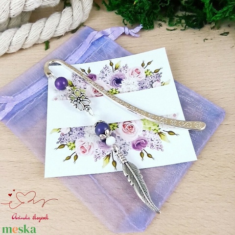 Toll könyvjelző lila és fehér gyöngyökkel, valamint tibeti ezüst kiegészítőkkel díszítve.