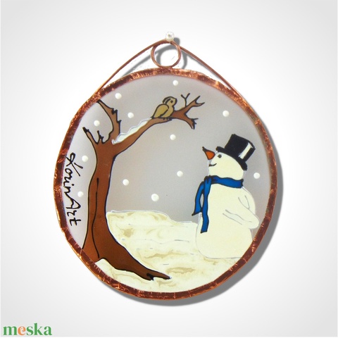 Hóember madárkával - Üvegfestmény, Karácsonyfadísz vagy hűtőmágnes, mágnes