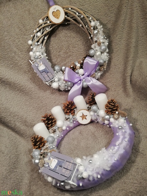 - Anyaga: szalmakoszorú, vesszőkoszorú, szaténszalag, termések, műhó, hungarocell gömbök