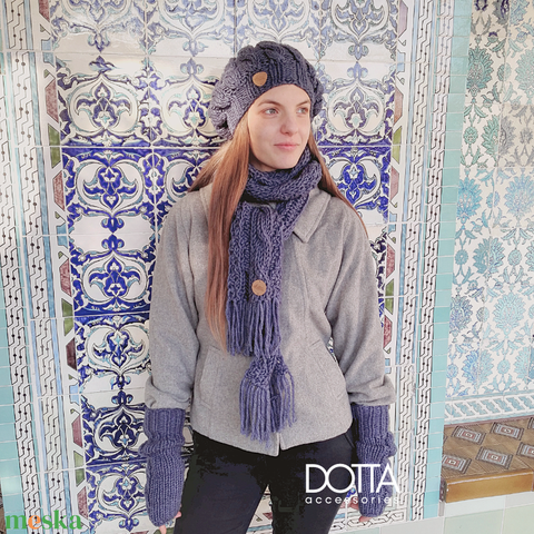 Dotta kötött női szett - sapka sál kézmelegítő télire - gyapjús vastag fonalból - puha meleg beret hosszú sállal