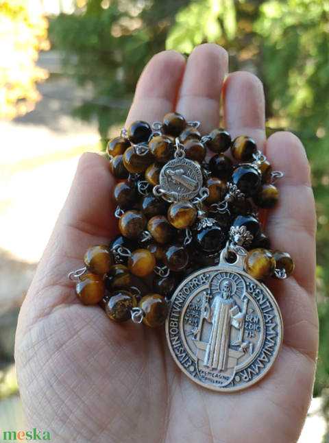 5 tizedes tigrisszem és ónix rózsafüzér, Szent Benedek éremmel. Használható gyógyító, védelmező amulettnek, ima vagy mantrafüzérnek, hordható nyakban vagy autóban.