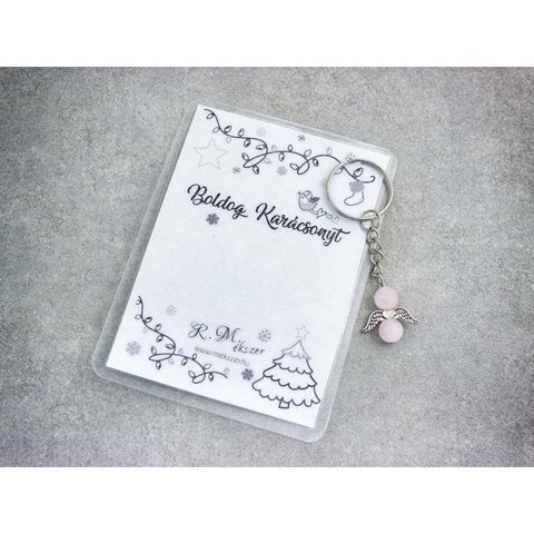 Számotokra állítottunk össze egy kedves meglepetést!"Boldog Karácsonyt"feliratos ajándékkártya rózsakvarc kulcstartóvalA kulcstartót a kártyával együtt kapjátok meg!A köszönő csomag tartalma: 1 db rózsakvarc díszes kulcstartó 1 db köszönő kártyaVan, amikor nehéz szavakat találni, vagy egészen egyszerűen hangok nélkül szeretnénk kifejezni a gondolatainkat, érzéseinket. Ebben segítenek kívánság vagy köszönő kártyáink, melyek a kiválasztott kulcstartóval együtt csodálatos ajándékok lehetnek. A laminált kívánság kártya mérete 110×80 mm.Amit a rózsakvarcról érdemes tudnod:A festetlen rózsakvarc az egész világos, szinte áttetszőtől, a ködös középrózsaszínig terjed. Az egyik legnépszerűbb kövek egyike, amely szépséges küllemének és erős gyógyhatásának köszönhető. Története a görög és római mitológiába nyúlik vissza, amely szerint a rózsakvarc Erósznak és Ámornak a szerelem Isteneinek az emberek felé nyújtott ajándéka.Lelki gyógyhatás:Már tehát az ókoriak is hittek a kő szerelem terén gyakorolt pozitív hatásaiban. A rózsakvarc a szívcsakrán keresztül segít az érzelmi blokádok feloldásában, megnyitja belső kapukat, hogy a csodát, szeretetet és szerelem formájában magunkévá tehessük. Érzelmi blokkok feloldása a szerelem lelki és testi kiteljesedését segíti. Az érzelmi gátak felszabadítása a termékenységet is magában hordozza, így ez a kő terméketlenség esetén is hasznos lehet. A rózsakvarc egyéb területeken is bizonyíthatja pozitív hatásait. Mivel segít megtalálni az életben a szépséget és a szeretet lelki egyensúlyunk helyre billentése és alkotó gondolatok megtalálása terén is hasznunkra lehet ez az ásvány. Használjuk meditáció közben haragunk leküzdéséhez és szeretetünk, szerelmünk kiteljesítéséhez.Testi gyógyhatás:Ez a rózsaszín különlegesség testi bajainkra gyógyírt jelenthet, mint a szívcsakra köve, a bőrbetegségek, asztma, allergia és vérszegénység ellen használhatjuk. Védi és erősíti a szívet, harmonizálja a szívritmust.Hozzárendelt mágikus hatás:Sokak szerint a rózsakvarc nem csak a már meglévő szerelmünk intenzívebbé tételében segíthet, hanem az áhított szerelem megtalálásában, magunkhoz vonzásában is.Csillagjegyei: Bika, Rák, MérlegCsakrája: SzívcsakraFigyelem! Az ásványokat, kristályokat az őskor óta használják a test, a lélek és az érzelmek harmonizálására. Az ókori kultúrákban kifejezetten elterjedtek voltak. Az évezredek alatt számtalan tudás és tapasztalat gyűlt össze róluk. Ásvány ékszereink leírásánál a meghatározó szakirodalom alapján készült összegzések olvashatók. Fontos! Az ásvány ékszerek viselése, az ásványok és kristályok gyógyításban, alternatív terápiaként való használata nem helyettesíti a modern orvostudományt, a gyógyszeres kezelést. Betegség esetén az öngyógyítás helyett kérjük, forduljon szakemberhez!