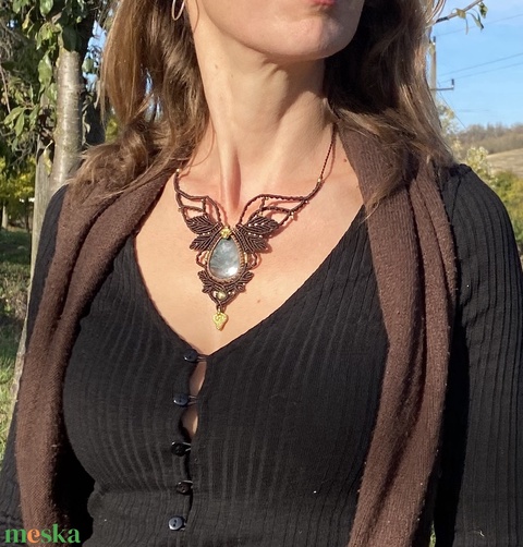 Moha akhát makramé leveles nyaklánc réz gyöngyökkel. Kék fényü leveles labradorit nyakék. Egyedi tündérnyakék.