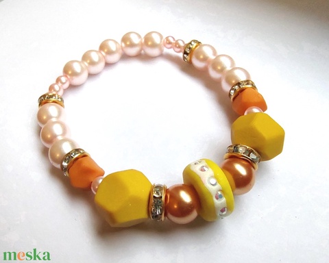 Sárga, narancs, rózsaszín gyöngyház és strasszos arany színű karkötő