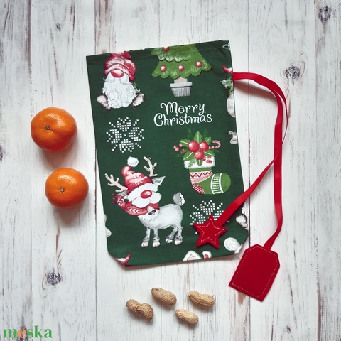Nevesíthető, fenyőzöld Télapós textil Mikulás zsák a celofán zacskó helyett