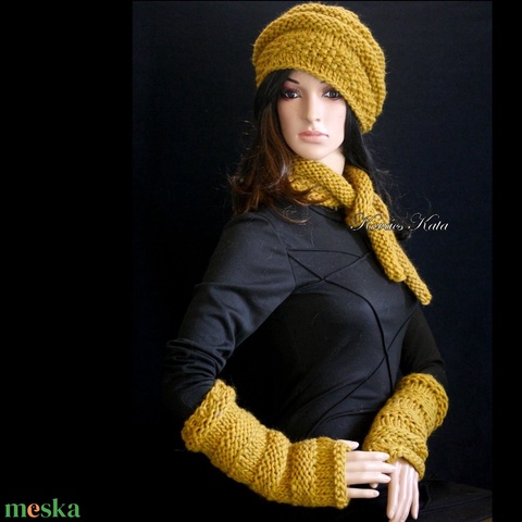CSIGA-SZETT - kézzel kötött sapka sál kesztyűszár együttes / curry