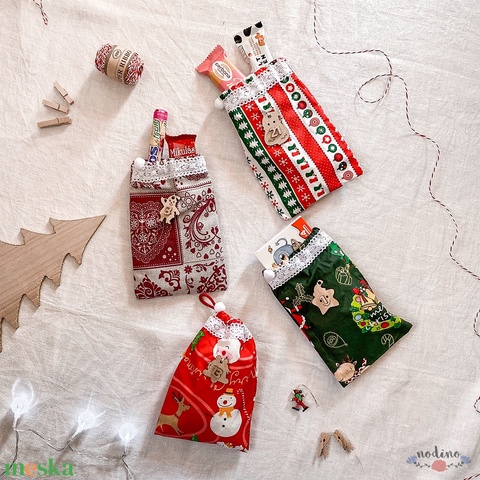 Adventi naptár, vidám mintás zsákok csipkével és fa számokkal, karácsonyi dekoráció (24 darab)