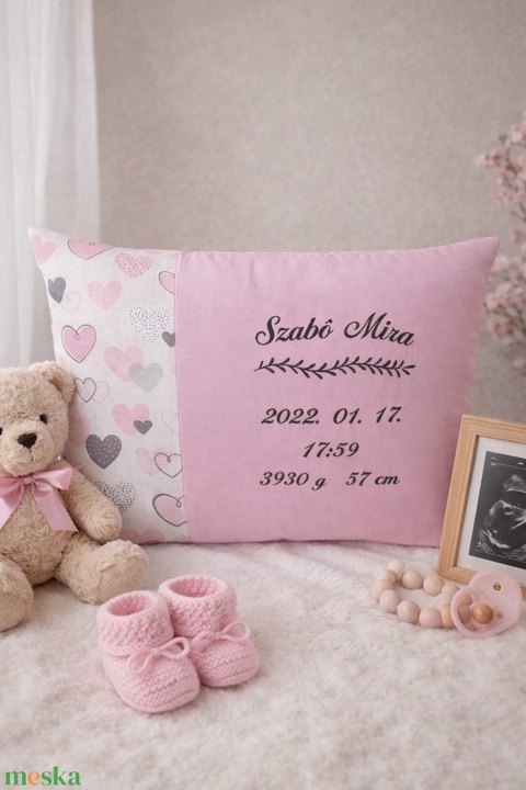 Hímzett születési párna - szívecskés