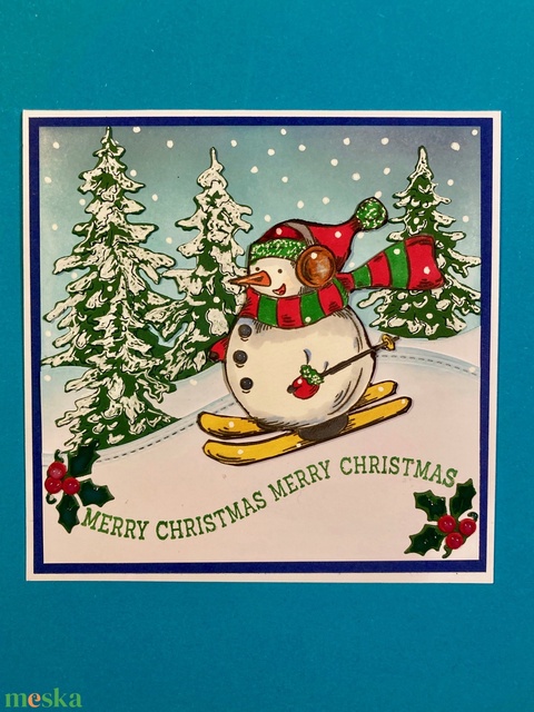Síelő hóember karácsonyi képeslap, ajándékkísérő