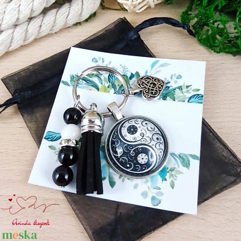 Jinjang mintás fekete bojtos üveglencsés kulcstartó táskadísz