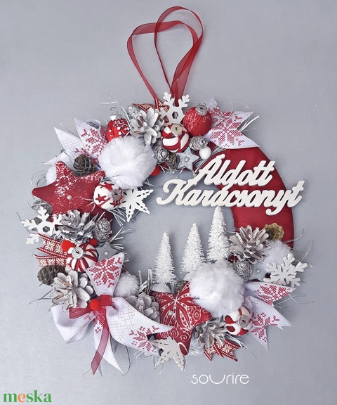 - Anyaga: textil, toboz, szalag, szárított növényi rész, karton, hungarocell, fa hópihék, műanyag fenyő, fa felirat