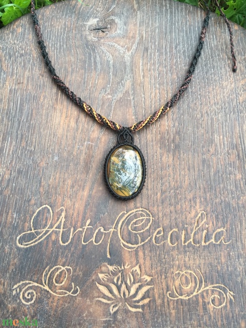 Gyönyörű Sólyomszem köves makramé nyaklánc. Solyomszem medál. Barna arany fekete Makramé nyaklánc
