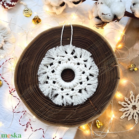 Bohém makramé hópehely karácsonyi dísz, natúr-fehér vagy csillogó natúr-arany fonalból, ünnepi dekoráció
