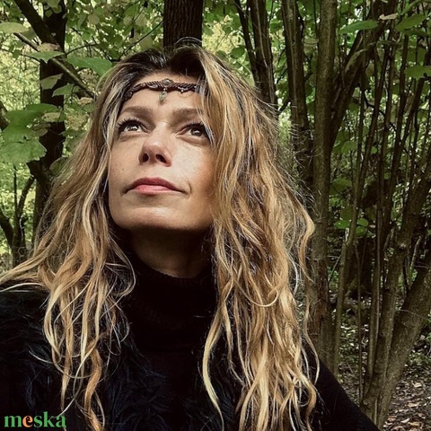 Labradorit fejdisz. Makramé nyaklánc réz gyöngyökkel. Kék fényü labradorit leveles nyakék. Egyedi tündérnyakék.
