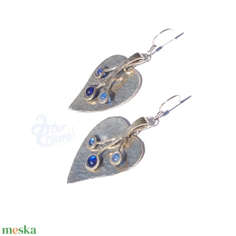 Sötétkék tűzzománcbogyós, levél alakú alpakka fülbevaló
