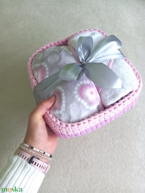 Babalátogató ajándékcsomag horgolt kosárban - Vattacukor