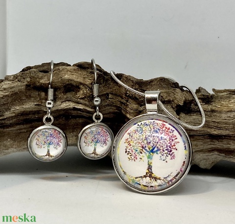 Életfa motívum, szivárvány cabochon, üveglencsés füli és medál