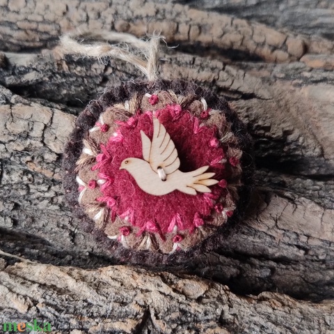 Bordó galamb mandala - hímzett gyapjúfilc karácsonyfadísz, ajándék kísérő, kulcstartó, táska dísz