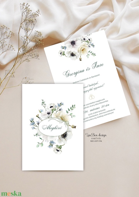 Elegáns eljegyzési meghívó fehér anemone virággal, selyemfényű papíron