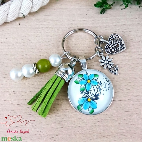 Virág kalitka zöld bojtos üveglencsés kulcstartó táskadísz