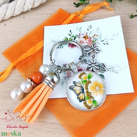 Sárga bojtból és üveggyöngyből és fehér tekla gyöngyökből, pillangó mintával díszített üveglencsés kabosonból, pillangó és virág medállal készült kulcstartó vagy táskadísz. A gyöngyöket gazdagon díszítettem tibeti ezüst gyöngykupakokkal és köztesekkel, medállal.