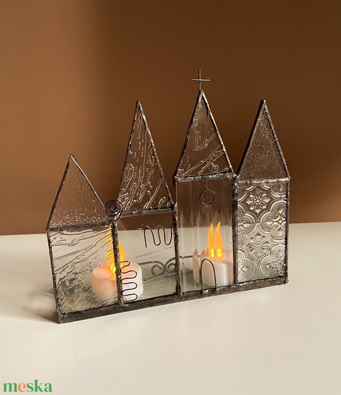 Tiffany technikával készült "Város" üvegmécses, üvegdísz, 3 db led mécsessel