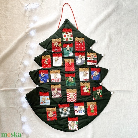 Zsebes adventi naptár, sötétzöld karácsonyfa alakú, ünnepi figurás fa számokkal, arany csipkével, akasztós