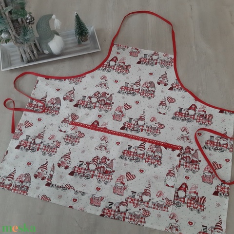 Ünnepi kötény hölgyeknek - vonatozó manók, piros és bézs színvilágban