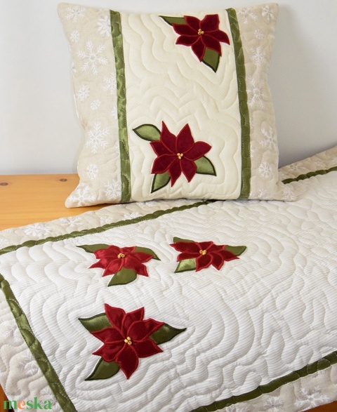 Adventi lakástextil, asztalterítő, asztali futó, díszpárna, mikulásvirágos, piros, zöld, natúr, fagyöngy gombdíszekkel