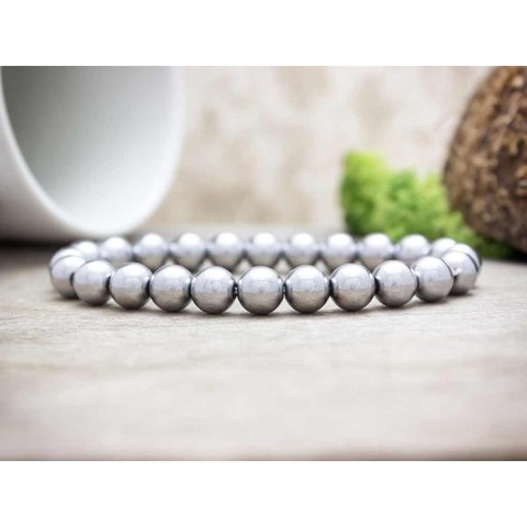 8 mm-es hematit ásvány gyöngyökből speciális gumira fűzött karkötő.Amit a hematitról érdemes tudnod: Ez a metálosan csillogó szürkés-barnás kő más néven "vérkőként" is ismertté vált. Ez az elnevezés nem csak testi gyógyhatásai miatt illik rá, hanem mert csiszolásuk során az ember ujját vérpiros színűvé festi.  A hematit egy erős energiakő, segítségével a többi ásványi követ is feltölthetjük. Lelki gyógyhatás: A hematit körénk "épít" egy védőkorlátot, amely egyrészt segít bátrabban, céltudatosabban mozogni a világban, másrészt ellenállóbbá tesz a külső befolyásokkal szemben. A hematit fokozza a dinamikánkat, vitalitásunkat, aktiválja az akaraterőnket, javítva ezáltal az életminőségünkön. Mivel aktiváló hatású, így nem ajánlott használata pihenések alkalmával. Testi gyógyhatás: A már említett vöröses színe a magas vastartalmából adódik a kőnek, így igen hatásos a vérrel kapcsolatos betegségekre, így tehát pozitívan hat a vérképre, vérszegénység ellen is jó, kiegyenlíti a vérnyomás ingadozásait. Kiváló érelmeszesedés, lábdagadás, visszerek ellen. Hatására a vérömlenyek sokkal gyorsabban elmúlnak. Aranyér ellen is hatásos. Fokozza a test regenerálódási folyamatait, elősegíti a sebek gyógyulását. Segíti a májfunkciókat, így használatuk különösen ajánlott méregtelenítő kúrák során. Segít a rendszertelen menstruációkon is. Babavárás alatti fáradtság enyhítésére különösen ajánlott. Hozzárendelt mágikus hatás: Szerencsehozó amulettként ismert volt már a régi korokban, Babyloniában pl. segített a tulajdonosának megnyerni mindent pert. Az ősi Egyiptomban a hematitot a halottak feje alá tették, hogy megkönnyítse a lélek útját az örökkévalóságba. Magát Tutanhamont is egy hematitból készült szkarabeusz kísérte a végtelenbe tartó úton. A hematit ezen kívül megvéd a gonosz átkok ellen és óvja álmainkat. Csillagjegyei: Bak, Vízöntő, Kos, Skorpió Csakrái: Gyökércsakra Nikkelmentes ékszer. Egyedi tervezés alapján készült kézműves ékszer. Amennyiben egyéni kérésed van, vagy nem találod, amit szeretnél, keress engem bátran.   Figyelem! Az ásványokat, kristályokat az őskor óta használják a test, a lélek és az érzelmek harmonizálására. Az ókori kultúrákban kifejezetten elterjedtek voltak. Az évezredek alatt számtalan tudás és tapasztalat gyűlt össze róluk. Ásvány ékszereink leírásánál a meghatározó szakirodalom alapján készült összegzések olvashatók. Fontos! Az ásvány ékszerek viselése, az ásványok és kristályok gyógyításban, alternatív terápiaként való használata nem helyettesíti a modern orvostudományt, a gyógyszeres kezelést. Betegség esetén az öngyógyítás helyett kérjük, forduljon szakemberhez!