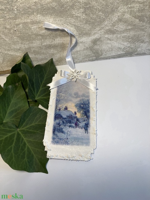 Karácsonyfadísz havas táj kékes hangulatban