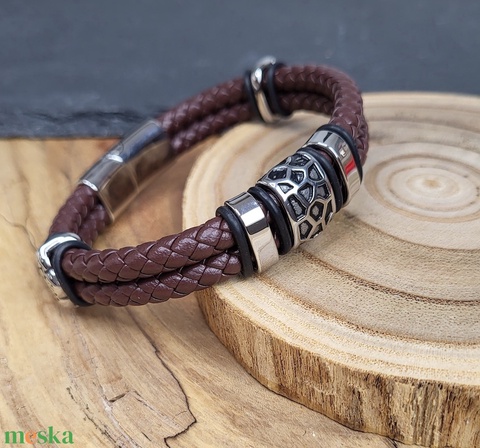 Férfi fonott Bőr karkötő barna, nemesacél mágnes csattal és kiegészítőkkel