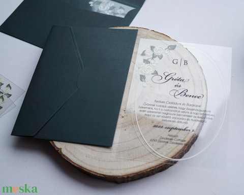 Plexi esküvői meghívó különleges sötétzöld díszborítékkal, kérhettek hozzá viaszpecsétet is, ennek az ára 210 ft/db.