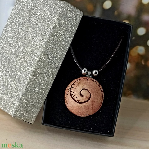 Nem mindennapi ajándék az illóolajok és az aromaterápia kedvelőinek! Sötétbarna hengerelt bőr nyaklánc, spirál motívumos, kör alakú medállal.
