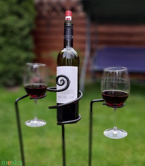 Kerti bulis borozós készlet: 4 db pohártartó, 1 db palacktartó - kovácsolt vas, földbe szúrható