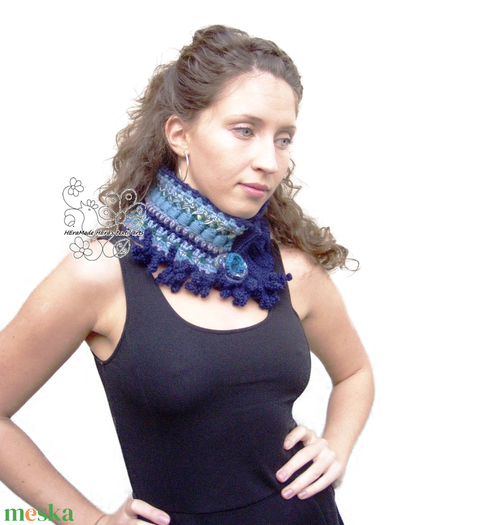 Sötétkék boho körsál kötött horgolt csősál öko gyapjú möbius sál rojtos