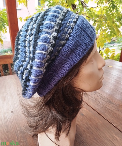 Barett horgolt kötött boho francia női sapka szürkés kék öko gyapjúból