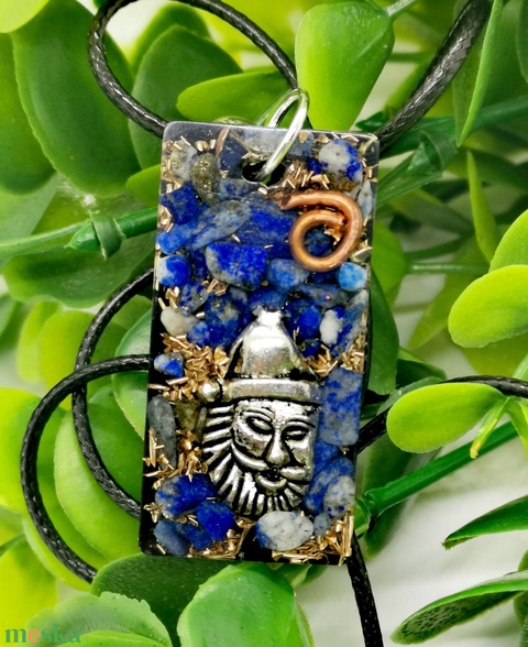 Téglalap alakú orgonit-sungit medál lapis lazulival ,fém Mikulásfejjjel,bronzforgáccsal,rézspirállal