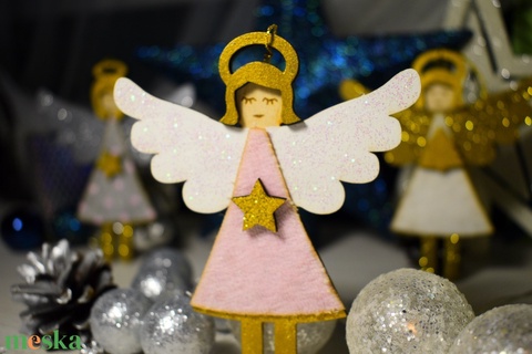 - Anyaga: natúr rétegelt nyírfa, ezüst-arany színű zsineg, arany-ezüst fa festék, arany-ezüst csillám, textil