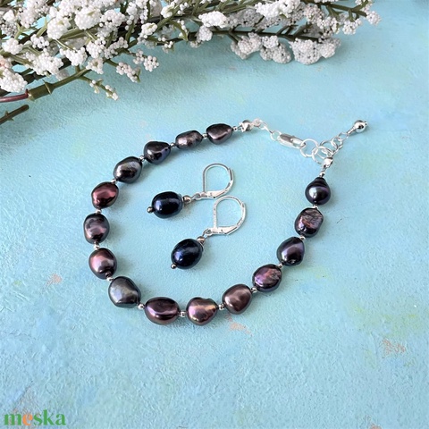 Sötétszürke édesvízi gyöngy karkötő/fülbevaló szett
