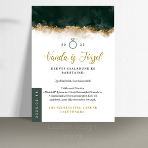 Elegáns, 1 oldalán nyomtatott esküvői meghívó, sötétzöld-arany grafikával.