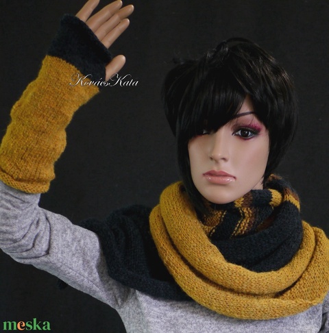ALPAKA-SZETT / sky - exkluzív kézzel kötött alpaka sál kesztyűszárral / curry-fekete