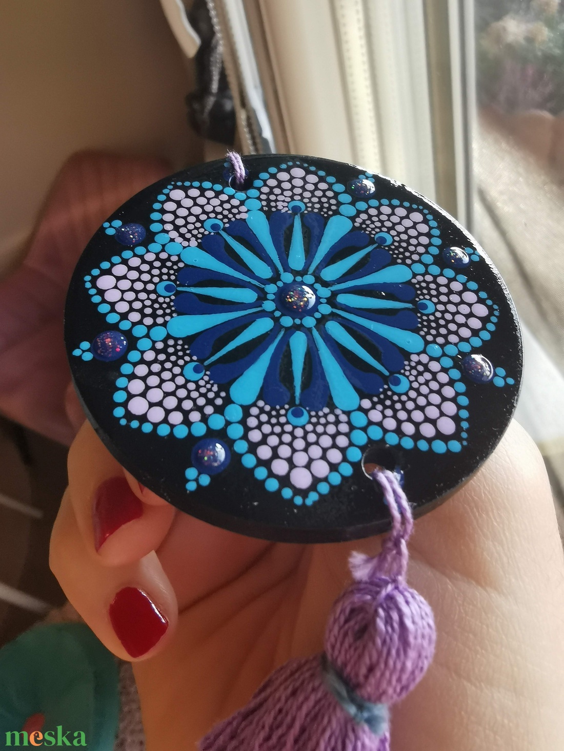 Fa korongra festett talizmán bojttal - Kék-lila
