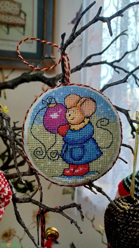 Keresztszemes karácsonyfadísz egér motívummal