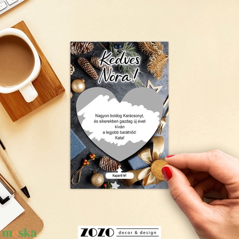 Ismerd meg a karácsonyi kaparós lapjaink egyedi és különleges varázsát, melyek alatt akár a te üzeneted is rejtőzhet! Bármilyen szöveggel kérhető, így a személyre szabott kis üzeneted egy felejthetetlen élménnyné varázsolja. Rendeld meg most, és tedd különlegessé az ünnepet kreatív ajándékokkal, ami garantált mosolyt csal mindenki arcára!