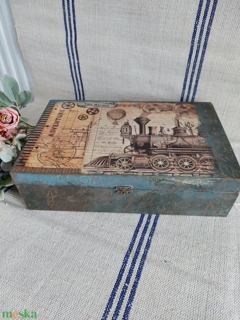 Vintage stílusú gőzmozdonyos doboz - díszdoboz - zöld- kék-arany szín