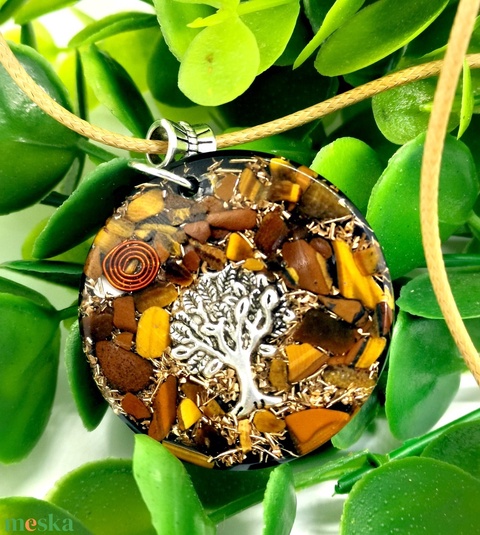 Nagy kerek orgonit-sungit medál tigrisszemmel fém szívvel ezüst színű fém életfával ,bronzforgáccsal,rézspirállal
